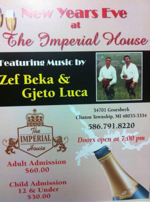 The Imperial house is Hosting New Years Eve Party. Tickets are available, Adults $60.00 Kids $30.00 Please purchase tickets in advance: Call 586-791-8220 or 313-574-5991.