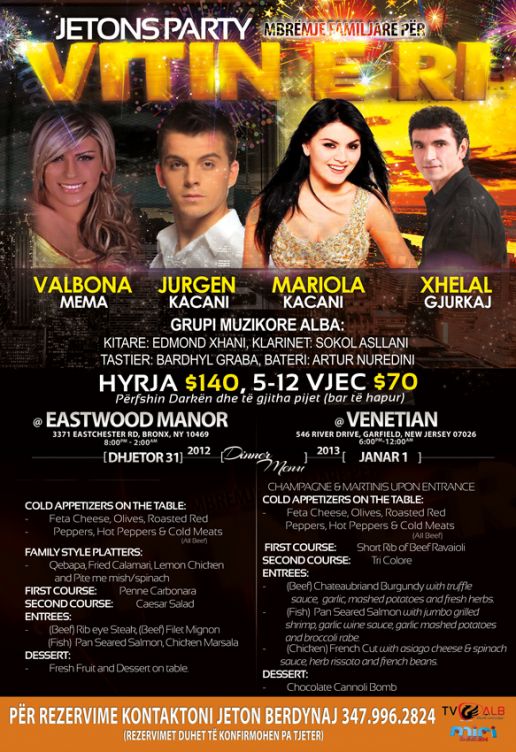 JETONS PARTY NEW YEAR'S 2013 performing Live VALBONA MEMA MARIOLA KACANI JURGEN KACANI XHELAL GJURKAJ & grupi muzikor ALBA JANUARY 1, 2013 @THE VENETIAN 546 RIVER ROAD, GARFIELD NJ 07026 Admission $140 and Kids 5-12 $70 Includes dinner and Open Bar all night, 4 Course Dinner and pastries 6:00pm-12:00am For reservations call Jeton 347.996.2824, please call in advance to secure your reservation. Jeton's New Yearะดัยปs parties are sold out every year. Tickets will be delivered to your house. Detail info at www.JetonsParty.com