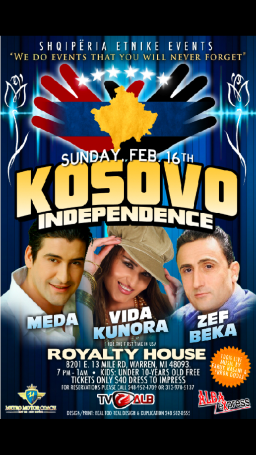 KOSOVO INDEPENDENCE on feb 16 with 3 of the most amazing singers MEDA. ZEF BEKA and the first time in the USA VIDA KUNORA 100% LIVE music by FARUK HASANI & FRROK DODAJ all ages are welcome @ ROYALTY HOUSE