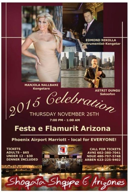 Te nderuar bashkatdhetare; Ju njoftojme se te enjeten,me daten 26 Nentor 2015 mbahet manifestimi qendror per shenimin e dites se madhe, dites se pavaresise, per komunitetin shqipetar te Arizones