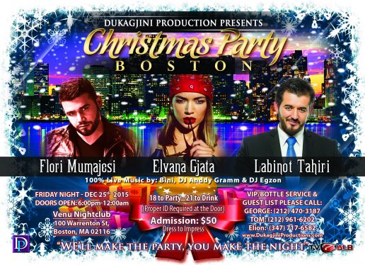 Dukagjini Production Presentsду_ Christmas Party, Boston.!! Friday Night, December 25, 2015 6:00pm to 12:00am Performing live. Flori Mumajesi, Elvana Gjata & Labinot Tahiri. 100% live music by Bini & DJ Anddy Gramm and DJ Egzon. At: Venu Nightclub дуИ100 Warrenton St, Boston, MA 02116 18 to party 21 to drink Dress to Impress! VIP/Bottle Service & Guest List Please Call: George (212) 470~3187 Tom: (212) 961~6202 Email:дуИDukagjiniProduction@yahoo.com Or visit us At:www.DukagjiniProductions.com