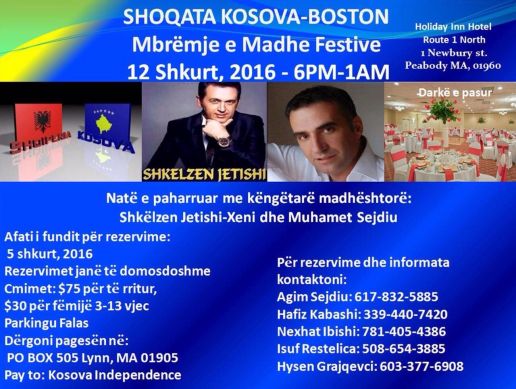 Mbrн‚mje Festive me rastin e 8 vjetroit se Pavarsis se Kosoves. Natн‚ e pa harruar me kн‚ngн‚tar madhн‚shtorн‚: Shkelzen Jetishi-Xeni dhe Muhamet Sejdiu Per rezervime dhe me shum info kontakto ne numrat: (617) 832-5885 (508) 654-3885 (339) 440-7420 (781) 403- 4386 (603) 377-6908 Afati i fundit pн‚r rezervime: 5 shkurt, 2016 Rezervimet jan tн‚ domosdoshme.