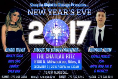 Me daten 12/31/2016 ne ora 7:00 PM nen organizimin e ''Shoqates Ulqini'' si shume vite tjera do festojme se bashku mbremjen e Vitit te Ri me kengetaret: ALMA VELAJ, ARDIAN JAKU dhe GRUPI ORIENTAL Ne Restorantin "CHATEAU RITZ" Adresa: 9100 N Milwaukee Ave. NILES, 60714 Poashtu si cdo vite do kemi lojen shperblyese dhe dhurata per femije! New Years Eve Party in Chicago Dec, 31 2016/17 will perform ALMA VELAJ, ARDIAN JAKU AND GRUPI ORIENTAL @ CHATEAU RITZ RESTAURANT