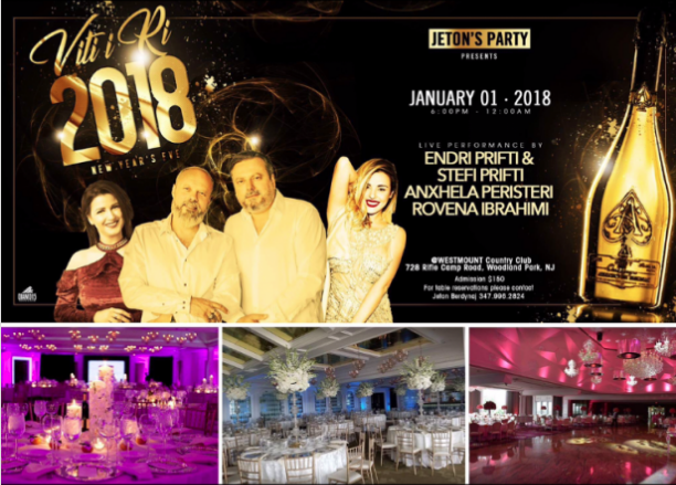 Jetons Family event New Years Day 1/1/18 at WESTMOUNT COUNTRY CLUB, New Jersey. LIVE: ENDRI & STEFI PRIFTI, ANXHELA PERISTERI, ROVENA IBRAHIMI. For reservations please call Jeton 347.996.2824, tickets will be delivered to your house.