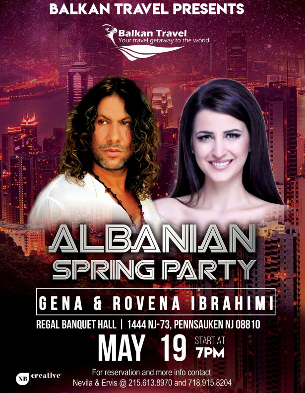 Balkan Travel & Entertainment presents Albanian Spring Party May 19th at 7 PM We are proud to bring you two of the best Albanian singers Gena & Rovena Ibrahimi. Come and join us in this incredible event. It will be a great night to be remembered. For reservations and more information contact Nevila & Ervis at 215.613.8970 & 718.915.8204