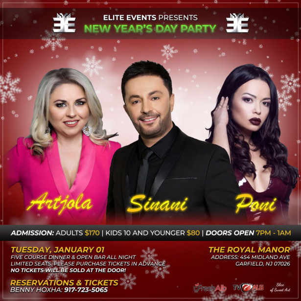 Elite Events presents to you New Year’s Day Party @ Royal Manor with **SINAN HOXHA**ARTJOLA TOSKA**PONI**! All tickets must be purchased in advance $170/$80 kids under 10. Five course meal included + Open bar! Call for your tickets & reservations. BENNY HOXHA 917-723-5065