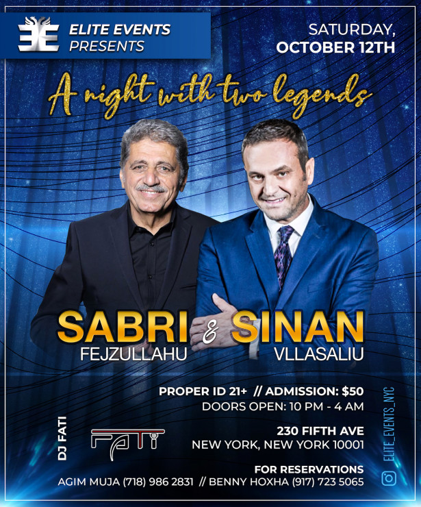 Elite Events presents SABRI FEJZULLAHU & SINAN VLLASALIU at 230 Fifth! Spinning: DJ Fati, Music by Ilir Dj. Saturday night October 12th. 10pm to 4am. $50 tickets, sold at the door. 21+ with proper id. Dress to impress. Call for VIP tables: Agim 718-986-2831 or Benny 917-723-5065
