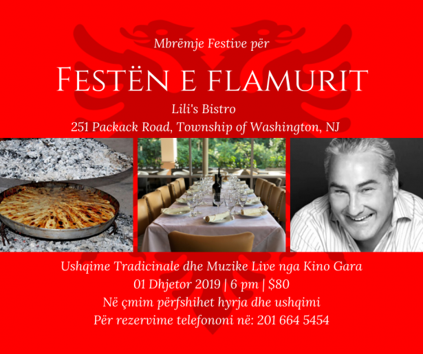 Mbrëmje Festive për Festen e Flamurit Ushqime Tradicionale dhe Muzikë Live nga Kino Gara Per rezervime telefononi në - 201 664 5454 $80 për përson / $40 per fëmijë nën moshën 12 vjec