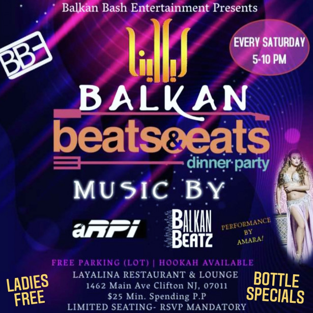 Balkan food, Balkan music, hookah, belly dancer, & bottle specials every Saturday 5-10pm. Message @balkanbash on Instagram or text 201-458-2187 to RSVP.