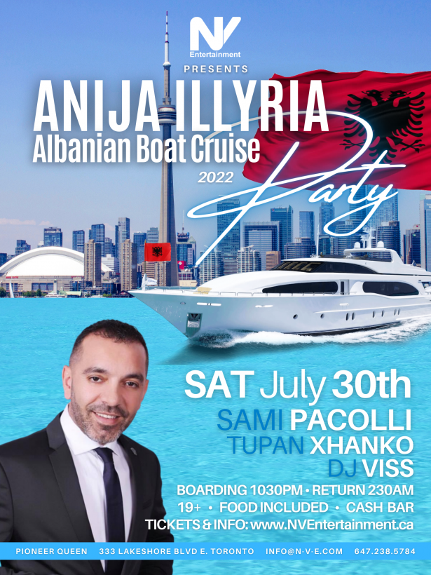 ANIJA ILLYRIA - ALBANIAN BOAT CRUISE PARTY Join NV Entertainment this summer for our annual Albanian Boat Cruise Party, 'Anija Illyria', located on Lake Ontario, Downtown Toronto, Canada! Date: Saturday July 30th 2022 Time: 1030PM-230AM - Note: Boarding starts at 10:30PM and the boat departs by 1045-11PM, Returns by 230AM - Please arrive early (by 10PM latest) to avoid traffic/parking/delays/line-ups! Address: 333 Lakeshore Blvd. E Downtown Toronto Boat: PIONEER QUEEN 19+ Social Event (Must provide a Government ID prior to entry) Evening Cruise on Lake Ontario, Downtown Toronto Music by DJ VISS Tupan by XHANKO Live Performance by SAMI PACOLLI (keyboard & singing) Full-Sized Cash Bar Food by Old Mill Cafe is included with your ticket! Meals will include Chevap & Burek (Cheese & Spinach)! Videography & Photography on board Bottle Service Available (10 Stand Up Tables Available) Retractable Roof Amazing Views of Downtown Toronto Newly renovated interiors Audio-visual equipment Mood lighting BUY YOUR TICKETS: General Admission: $80 • Online at: www.n-v-e.com or www.nventertainment.ca > Events • Online at: www.anijaillyria.eventbrite.com • At The Door (If Available) • E-Transfer: info@n-v-e.com > Must text 6472385784 or email with First Name, Last Name, Email Address, # Of Tickets. Food Caterers: Food by Old Mill Cafe is included with your ticket! Meals will include Chevap & Burek (Cheese & Spinach)! Videography/Photography on site. Check out the videos and pictures from 2016, 2017, 2018, 2019, 2021 on Facebook: www.facebook.com/nvgta Directions & Parking Address: 333 Lakeshore Blvd E. Downtown Toronto Paid-Parking Available On-Site Contact: Info@n-v-e.com (647)238-5784 www.n-v-e.com | www.nventertainment.ca Follow & Like us: www.facebook.com/NVGTA www.instagram.com/NVGTA www.twitter.com/NVGTA @NVGTA #NVGTA #NVEntertainment