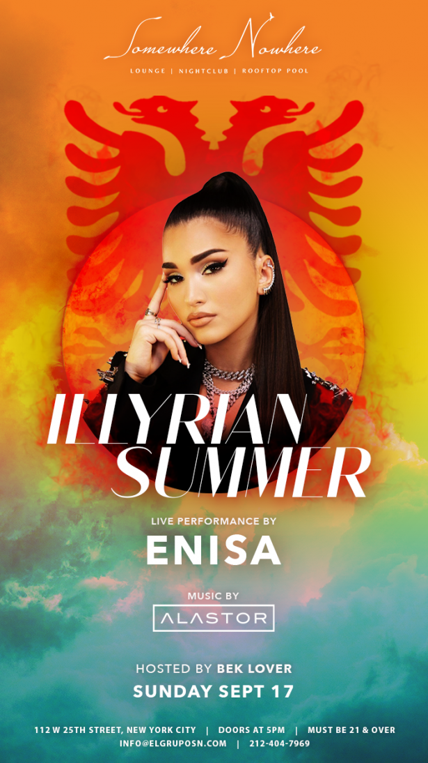 Illyrian Summer: End of Summer Party Where: New Yorkβs most exclusive rooftop and lounge. Somewhere Nowhere Rooftop. Sunday, September 17th,2023 ENISA performing live. Alastor mixing Hosue and Albo music. Hosted by Bek Lover Tables highly recommended and limited. This is the most exclusive gathering. Period!