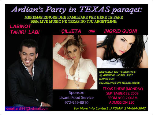 ARDIAN'S PARTY IN TEXAS PRESENTS HOTEST PARTY IN TEXAS EVER PERFORMIN LIVE: LABINOT TAHIRI-LABI,CHILJETA,DHE INGRID GJONI ADMISSION 50$ @ ADMIRAL HOTEL 1507.N.WATSON RD,ARLINGTON TEXAS,76006 MONDAY SEP.28.2009 PARTY START TIME 8:00pm-2:00AM FOR MORE INFO CONTACT ARDIAN @ 1-214-664-3042 or e mail:ardi96@hotmail.com SPONSOR:LISANTI FOOD SERVICE OF TEXAS...