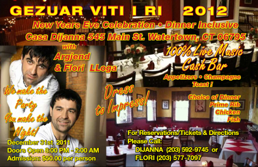 Spend the New Year with us! Don't miss out on the best Albanian Party in Connecticut. On December 31st at Casa Dijanna Restaurant in Watertown, Ct 06795. 100% live music with FLORI and ARGJEND LLOGA. Call Dijanna at (203)592-9745 or Flori at (203)577-7097 for reservations and tickets. Admission: $50.00 per person, food included. Cash bar all night long! Don't miss out on this amazing night with your family and friends. Hope to see you there!!! Kaloni nje mbremje fundviti te mrekullueshme me ne. Muzike live nga te gjitha trevat shqiptare me kengetaret e mirenjohur FLORI dhe ARGJEND LLOGA. Telefononi Dijanna per prenotime (203)592-9745 ose Flori (203)577-7097. $50.00 per person, ushqimi i perfshire. Ju mirepresim!