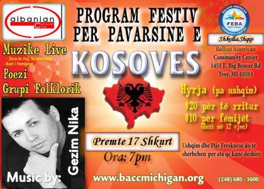 Program Festiv Per Pavarsine E KOSOVES Performing Artist: Gezim Nika Muzike Live Poezi Grupi Folklorik Hyrja (pa ushqim) $20 per te rritur $10 per femijet (deri ne 12 vjec) Balkan American Community Center 1451 E. Big Beaver Rd Troy, MI 48083 Premte 17 Shkurt Ora 7pm