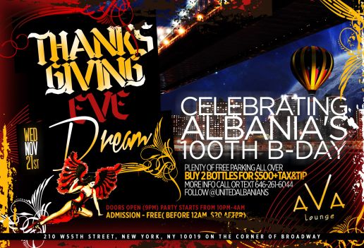 United Albanians Presents: The Thanksgiving Eve Dream @ The Dream Hotel Midtown On the Corner of W55th Street & Broadway We took over the whole Dream Hotel, from the 1st Floor, all the way up to the Ava Lounge Penthouse, with out door terrace, weather permitting, but smoking section is available. 2 Floors, 3 Djs(Dj Edi, Dj Chris W, and 1 other special guest) spinning house, hip-hop, and Albo, on the Biggest Party Night of The Year... Since it is Albania's 100 Year Birthday Everyone is Free before 12am, $20 after. Buy 2 Bottles of anything for $500+... Tables Limited to the only Albanian Party going on Thanksgiving Eve, and the 1st time at the Dream Hotel... Age- 21 For All, Dress to Impress... For more info or tables call or text 646-261-6044 Follow us @UnitedAlbanians Plenty of Free Parking all over the area, along Broadway, the side streets and 8th Avenue. United Albanians: Doing things, Albanians, never dreamed of... Are You United?