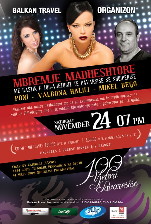 Balkan Travel prezanton koncertin madheshtor familjar e rinor me rastin e 100 vjetorit te Pavarsise se Shqiperise per komunitetin shqiptar ne Philadelphia/New Jersey/Washington DC & Maryland. Kemi nderin tju sjellin para jush yllin e muzikes popullore labe Poni, yllin i muzikes tironse Valbona Halili dhe kengetarin e talentuar fierak Mikel Bego. Vellezer dhe motra le te mblidhemi se bashku ne kete eveniment muzikor shqiptar dhe le te mbetet kjo nate nje nate e paharruar per te gjithe me 24 Nentor 2012 ne oren 7 pm ne restorantin luksoz Colleen's Caterers Savoy. Balkan Travel is proud to bring you the best Albanian events in the area and your satisfaction is our pleasure, so let's get together and celebrate our 100'th year of Albanian's independence. Per me shume informacion kontaktoni Ervisin dhe Nevilen ne zyrat e Balkan Travel 215.613.8970 dhe 718.915.8204