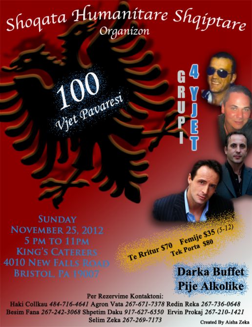 festojm 100 vjetorin e pavarsise te Kombit shqiptare. Ne Restorantin King's Caterers Sunday November 25 2012 5pm-11pm