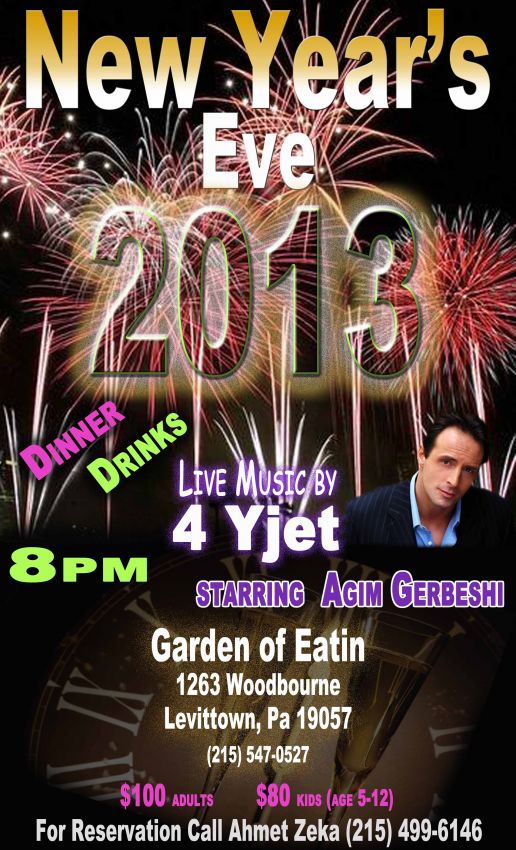 come celebrate New Year's Eve with us at the Garden Of Eatin. we have live music by 4 Yjet with Agim Gerbeshi. we will be serving full course dinner with drinks and albanian cuisine. price for adults are $100 Kids 5-12 $80 for reservations call Ahmet Zeka (215) 499-6146