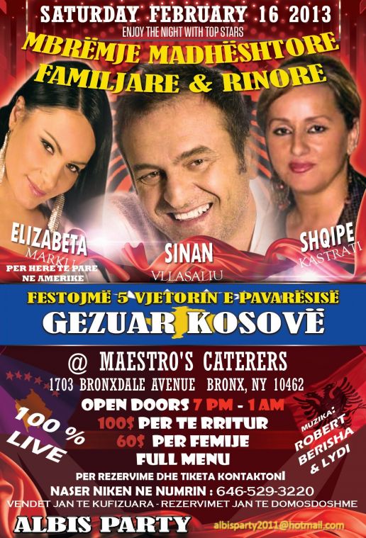 ALBIS PARTY ORGANIZONE MBREMJE FAMILJARE DHE RINORE ME RASTIN E 5, VJETORIT TE PAVARSISE SE KOSOVES. ME BILBILAT E KENGES SHQIPTARE. SINAN VLLASALIU,ELIZABETA MARKU DHE SHQIPE KASTRATI. 100% LIVE MUSIC BY ROBERT BERISHA AND LYDI. SATURDAY NIGHT FEBRUARY 16, 2013 7:00pm~1:00am AT: MAESTRO'S CATERERS 1703 BRONXDALE AVENUE BRONX 10462. 5, COURSE DINNER & OPEN BAR ALL NIGHT LONG, FREE VALET PARKING. VELLEZER DHE MOTRA EJANI TE FESTOJME SEBASHKU, LE TE MBETET KJO NATE E PAHARRUAR. LIMITED SEATS PLEASE PURCHASE THEM IN ADVANCE. WE WILL DELIVER THE TICKETS AT YOUR DOOR FOR FREE. ADMISSION ADULTS: $100 KIDS: 5-12 $60 TO PURCHASE YOUR TICKETS PLEASE CALL: NASER NIKA # 646 529 3220 .