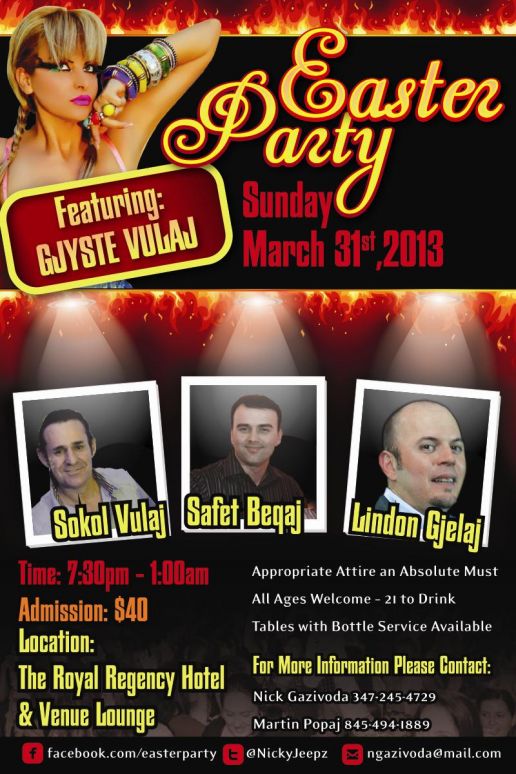 EASTER PARTY SUNDAY MARCH 31ST 2013 BACK BY POPULAR DEMAND, PERFORMING LIVE, THE ONE AND ONLY GJYSTE VULAJ ALSO PERFORMING LINDON GJELAJ MUSIC BY: SOKOL VULAJ AND SAFET BEQAJ TIME: 7:30PM ะดัั 1:00AM ADMISSION: $40 APPROPRIATE ATTIRE IS AN ABSOLUTE MUST ALL AGES WELCOME 21 TO DRINK BOTTLE SERVICE AVAILABLE LIMITED TABLES AVAILABLE FOR MORE INFORMATION PLEASE CONTACT NICK GAZIVODA 347-245-4729 MARTIN POPAJ 845-494-1889 WWW.FACEBOOK.COM/EASTERPARTY TWITTER @NICKYJEEPZ ngazivoda@me.com THE ROYAL REGENCY HOTEL & VENUE LOUNGE 165 TUCKAHOE ROAD YONKERS NY