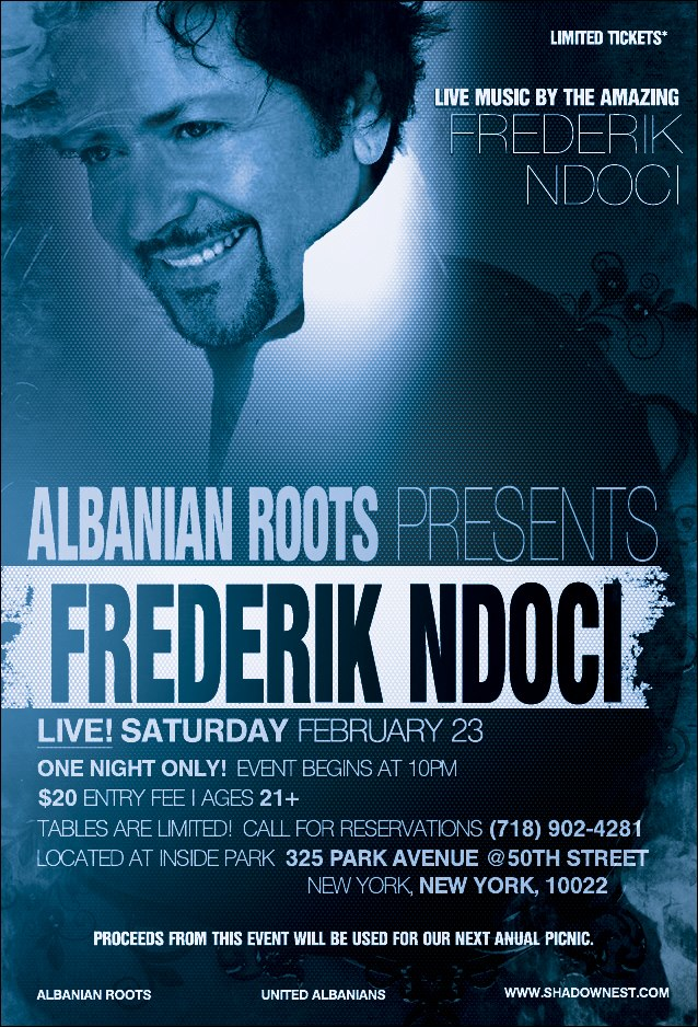 Hello everyone, Please join Albanian Roots this Saturday February 23rd at Inside Park NYC for a fun night with an amazing Albanian singer Frederik Ndoci!! The entrance fee is $20! 21+ to get in We are using this event to fund-raise for our next event our annual picnic so we need all of your support...