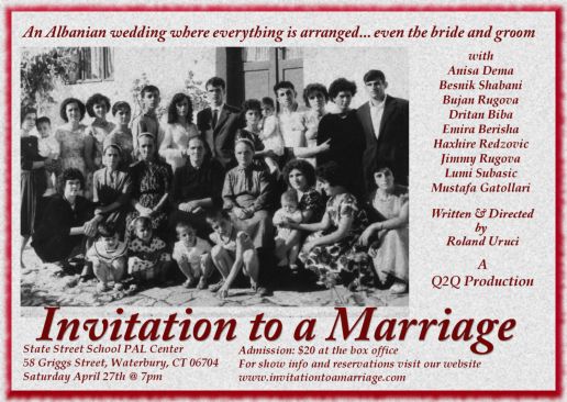 For one time only, Invitation To A Marriage is coming to Waterbury, CT! Please join us for a evening of laughter! Tell your friends and family and help us spread the word. About the play. This play is a hilarious depiction of a new generation of Albanians in America trying to establish a life for themselves, while dealing with the traditions and European culture of their parents. It is a universal story that works really well through the able guidance of Uruci, who proves his multi-faceted talents by not only writing, producing, and directing the show, but also acting in it as well.