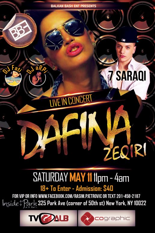 ** DAFINA ZEQIRI - 7 SARACI - DJ FATI - DJ aRPi ** On Saturday May 11, Dafina Zeqiri & 7 Saraqi will be performing LIVE alongside DJ Fati & DJ aRPi at Inside Park located at 325 Park Ave (corner of 50th st) NY, NY 10022. Doors open 11pm - 4am and is 18+ for all to enter. Admission is $40 at the door only (NO PRE-SALE TICKETS). Some VIP tables have already been booked due to high demand for this event and only a limited amount of tables left. Please contact me ASAP, first come first serve! You can private message Rasim Pjetrovic or text (201)458-2187 for VIP or general info. This is the first Albanian concert event hosted by BALKAN BASH ENT!, so don't miss out on this experience. See you all soon!