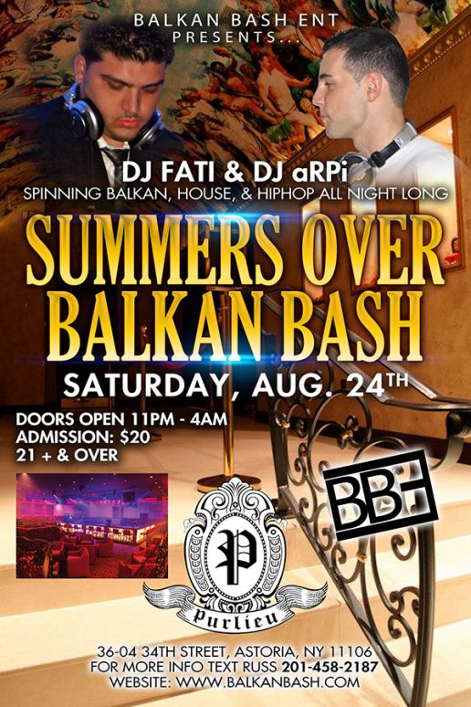 ** Bringing back the old school parties with lots of cultural music this time around (valle, shota, etc) ** The Summers Over BALKAN BASH is back again happening on Saturday Aug. 24th at the newest and most upscale venue in Astoria, Queens called PURLIEU! It's located at 36-04 34th st (corner of 36th Ave). Doors will open at 11pm - 4am and its 21+ to enter. Since this is an upscale nightclub please keep the dress code trendy and neat (no hats or baggy clothes). DJ Fati & DJ aRPi will be spinning the Balkan, House, & HipHop all night as always. VIP: to book a table please TEXT Russ at 201-458-2187 Ramadan is finally over and this is a huge event at the end of each summer so see you all soon!!!