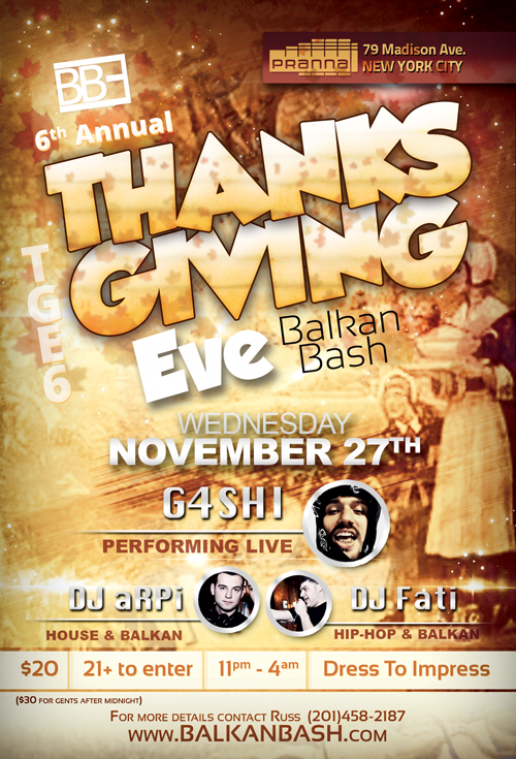 ** www.BALKANBASH.com ** The BIGGEST party of the year is back!!! The 6th Annual Thanksgiving Eve BALKAN BASH is happening on Wednesday, November 27th at Pranna on 79 Madison Ave (corner of 28th st) NYC. This time around we have Hot 97 & Albania's own G4SHI performing LIVE. DJ Fati & DJ aRPi will be spinning house, hiphop, and Balkan all night long. Doors open 11pm-4am and ages are 21+ for all. Admission is $20 (guys $30 after midnight). Please dress to impress as this is a very upscale lounge. For more info or VIP, please go to www.balkanbash.com and sign up. You may win FREE entrance & VIP for you and 2 friends (3 total). SEE YOU THERE!!!