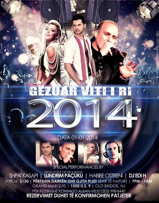 LIVE MUSIC 01-01-2014 NEW YEARS DAY TIME 7:00PM - 1:00AM @ GRAND MARQUIS 1550 U.S. 9 Old bridge NJ Performing Live SHPAT KASAPI, HABIBE OSTRENI, LUNDRIM PACUKU & DJ EDI Tickets $130 includes a 5 course meal and open bar all night. Must make reservations in advance. No tickets will be sold at the door. to reserve your table today call: Alban Veliu at 203.998.8440