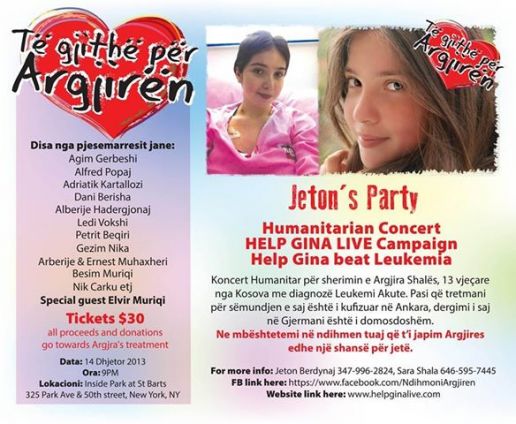 Jeton's Party Humanitarian Party, help Gina Live Campaign. Sat Dec 14 at 9:PM at Inside Park, 50th st and Park Ave. I thank re entertainers on the flyers for contributing their time and willing to do anything to help Gina. Please share the flyer, pass the message and support the campaign on Dec 14. Let's get together and support a cause. Performing Live Gezim Nika Agim Gerbeshi Smajl Puraj Alberije Hadergjonaj Besim Muriqi