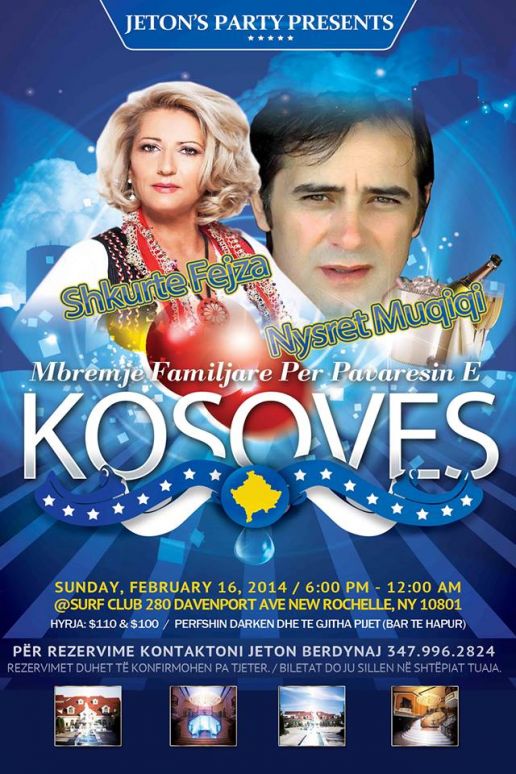 Jeton's Party announcement for KOSOVA INDEPENDENCE, performing live: NYSTRET MUQIQI & SHKURTE FEJZA. Sunday Feb 16 @ SURF COUNTRY CLUB, New Rochelle, NY. Admission $100 and $110, includes dinner and open bar all night. Reservation a must, please call Jeton Berdynaj for reservations at 347.996.2824