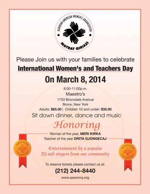 7-8 MARS 2014 Celebration Dear Members and Supporters, Albanian American Womenะดัยปs Organization (Motrat Qiriazi) AAWO invites you and your families to celebrate INTERNATIONAL WOMEN'S AND TEACHERS DAY TICKETS FOR THIS FAMILY EVENT INCLUDE DINNER, OPEN BAR & MUSIC. IN ADDITION, THERE WILL BE RAFFLES, PRICES & OTHER SURPRISES. MARCH 8, 2014 6:00-11:00P.M TICKET : ADULTS $65 CHILDREN $35 TICKETS ARE BEING SOLD ONLINE: To purchase tickets online please go to our web page at http://aawomq.org/category/upcoming-events/ or call 1-212-244-8440 Visit our Facebook page at https://www.facebook.com/AAWOMQ WE THANK YOU ALL FOR YOUR SUPPORT!