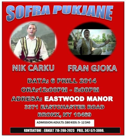 SOFRA PUKAJANE ORGANIZON MRAMJEM FAMILJARE PER HER TE PARE NE NEW YORK CITY. APRIL 6, 2014. 12:00pm~5:00pm AT: EASTWOOD MANOR 3371 EASTCHASTER ROAD BRONX, NY 10469 3 COURSE DINNER & OPEN BAR , FREE VALET PARKING. LIMITED SEATS PLEASE PURCHASE THEM IN ADVANCE. ADMISSION ADULTS: $80 KIDS: 5-12 $40 TO PURCHASE YOUR TICKETS PLEASE CALL: ERNEAT 718-288-2923 PREL. 347-571-3866.