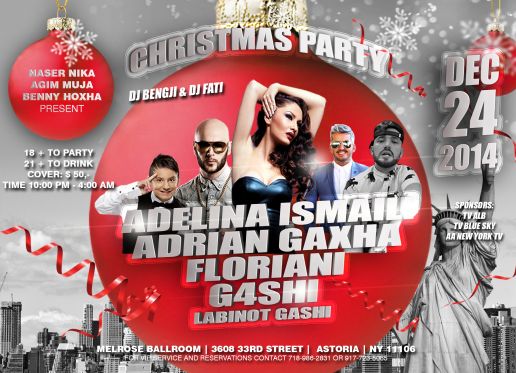December 24, 2014 Christmas Party, presented to you by Naser Nika, Agim Muja & Benny Hoxha. Performing: дмйADELINA ISMAILI дмйFLORIANI дмйADRIAN GAXHA дмйG4SHI дмйHosted by LABINOT GASHI from 1 Kafe me Labin. Music by DJ FATI & DJ BENGJI. At the Melrose Ballroom, 3608 33rd St. Astoria NY, 11106. Btwn. 36th Ave & 37th Ave. 5 minutes from NYC. Valet Parking available. $50 Tickets, sold at the door. 18+ to Party, 21+ to Drink. ID is required. Doors open 10pm to 4am. Dress to Impress. For information, Bottle Specials or VIP tables, contact: 917-723-5065 or 718-986-2831