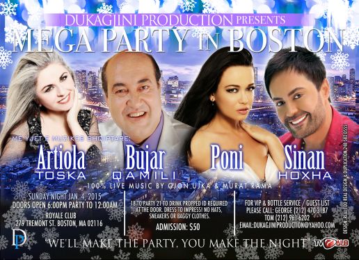 Dukagjini Production Presentду_ MEGA PARTY IN BOSTON. Sunday Night January 04, 2015. 6:00pm To 12:00am At: Royale 279 Tremont st Boston, MA 02116. Me Yjet e Muzikes Shqiptare: Aritiola Toska Bujar Qamili & Sinan Hoxha. 100% Live Music By: Albert Ujka, Murat Rama & Qemal Kajushi. This will be a night to rememberду_ So donду»t miss it! No need to purchase tickets in advance! First come first serve. Tickets will be sold at the Club the night of the event. For mot info please Call: George: (212) 4703187 Tom: (212) 961-6202 Email: DukagjiniProduction@yahoo.com Admission: $50 No Hats, Sneakers or Baggy Clothes. ID REQUIRED AT THE DOOR. SO PLEASE MAKE SURE YOU HAVE YOUR ID WITH YOU. Ladies and Gentlemen lets celebrate togetherду_ думWeду»ll make the party, you make the nightдуќ