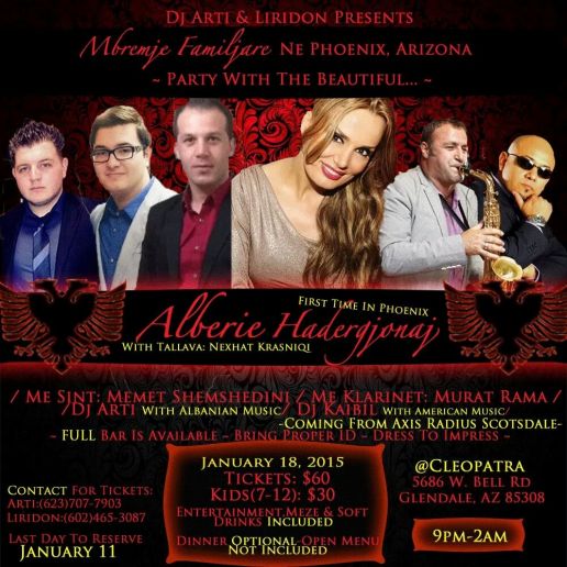 Mbremje Familjare Ne Phoenix, Arizona. Adults: $60 Kids: $30 - check flyer for age limit Singers: Alberie Hadergjonaj & Nexhat Krasniqi Dj Arti me keng shqip & Dj Kaibil me keng anglisht Murat Rama me klarinet & Memet Shemshedini me sint