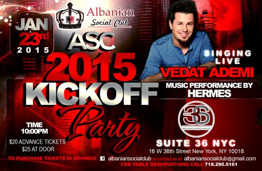ASC is hosting it's annual kick off party with Vedat Ademi singing live at Suite 36. Tickets are being sold in advance on eventbrite.com for $20 or $25 at the door. https://www.eventbrite.com/e/asc-2015-kick-off-party-with-vedat-ademi-tickets-15071044901 https://www.facebook.com/pages/Albanian-Social-Club/195165527349537 For table reservations call 718.290.5161