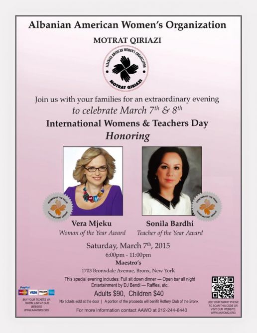 7-8 March 2015 Celebration Please join AAWO with your families and friends for an extraordinary evening to celebrate March 7 & 8, International Women's & Teacher's Day honoring VERA MJEKU- Woman of the Year Award & SONILA BARDHI- Teacher of the Year Award. Part of the proceeds,will support the Rotary Club of the Bronx,who for years is giving new hearts to our Albanian kids. This special evening includes: Full sit down dinner, open bar all night, entertainment by DJ Bendi, plus raffles. Adults $90, Children $40 Please RSVP. Tickets are sold online. No tickets sold at the door. BUY: http://aawomq.org/2015/01/27/7-8-march-2015-celebration/ https://www.facebook.com/events/1385734835069266/ 1-212-244-8440 president@aawomq.org Maestro's Caterers 1703 Bronxdale Avenue, Bronx, NY 10462