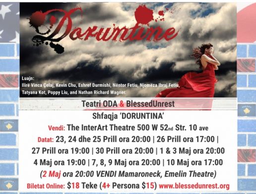 Teatri ODA dhe Blessed Unrest shfaqin shfaqjen dy gjuhн‚sore думDoruntinaдуќ nн‚ Nju Jork, SHBA. Njн‚ martesн‚ qн‚ e refuzon traditн‚n, njн‚ udhн‚tim i pamundur mbi kalн‚, njн‚ vн‚lla qн‚ e sfidon varrin. Inspiruar nga legjenda shqiptare siн_ н‚shtн‚ e shkruar nga Ismail Kadare, DORUNTINA н‚shtн‚ njн‚ rrн‚fim mitik i dashurisн‚ sн‚ ndaluar dhe rrezikut tн‚ Besн‚s qн‚ nuk mund thyhet kurrн‚. Ilirн‚ Vinca н€elaj, Kevin Chu, Eshref Durmishi, Nн‚ntor Fetiu, Njomн‚za Ibraj Fetiu, Tatyana Kot, Poppy Liu, and Nathan Richard Wagner. Shfaqja дуЦDORUNTINAду» ne New York Vendi: The InterArt Theatre 500 W 52nd Str. 10 ave Datat: 23, 24 dhe 25 Prill ora 20:00 | 26 Prill ora 17:00 | 27 Prill ora 19:00 | 30 Prill ora 20:00 | 1 & 3 Maj ora 20:00 4 Maj ora 19:00 | 7, 8, 9 Maj ora 20:00 | 10 Maj ora 17:00 Biletat Online: $18 Teke (4+ Persona $15) www.blessedunrest.org Me Shume: http://dardamedia.com/ministri-kujtim-shala-priti-kryetarin-e-komunes-se-struges-ziadin-sela/
