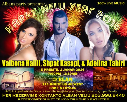 Albans Party presents 100% LIVE MUSIC 01.01.2016 Doors open 7:00pm till 1:30am Shpat Kasapi Valbona Halili Adelina Tahiri @ The Elan 111 Route Us 46 West Lodi, NJ 07644 7 course meal and full open bar $130 for adults and $70 for kids Must have tickets and reservations to enter. No tickets will be sold at the door! Call Alban Veliu for more info 203.998.8440