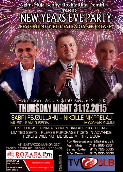 *NEW YEARS EVE* Thursday, December 31, 2015 @ Eastwood Manor. Performing: SABRI FEJZULLAHU, NIKOLLE NIKPRELAJ & MYZAFER KOLIQI! Party starts at 8pm to 3am. Tickets must be purchased in advance. $160 & kids 5-12 $80. Tickets will be delivered prior to the event. No tickets will be sold at the door. Includes Five course meal and open bar all night long! Dress to impress! Come ring in the New Year with your friends and family & party the night away with these Legends of Albanian Music!!!! For tickets or more info, contact: Agim Muja 718-986-2831 or Benny Hoxha 917-723-5065 or Rifat Demiri 917-668-6060