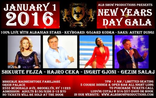 *** TICKETS WILL NOT BE SOLD AT THE DOOR *** ALB SHOW PRODUCTIONS PRESENTS NEW YEARS DAY GALA!!! LETS CELEBRATE TOGETHER! 100 % LIVE MUSIC WITH ALBANIAN STARS: SHKURTE FEJZA - INGRID GJONI-HAJRO CEKA - GEZIM SALAJ 5 COURSE DINNER & UNLIMITTED OPEN BAR ALL NIGHT LONG!