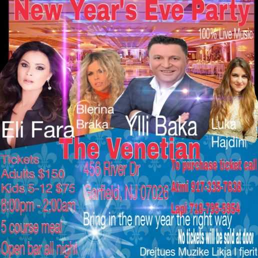 Come party with us this New Year's eve at the. Venetian restaurant located in Garfield New Jersey tickets will be 150 for adults 75 for kids 5 - 12 with singers Eli Fara, Ylli Baka , Blerina Braka and Luka Hajdini For tickets please call Atmi 917-335-7638 Lapi 718-795-5954 No tickets will be sold out door come join us the best food and music
