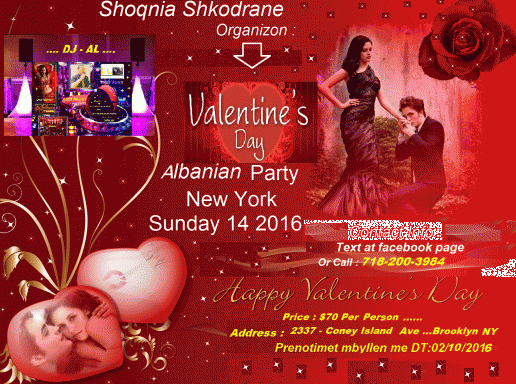 Per diten e Shen Valentinit ...Shoqnia Shkodrane organizon Mbremje festive. Rezervimet mbyllen me Dt 02/10/2016 $70 per person. Muzike e te gjitha trevave nga....DJ - AL....