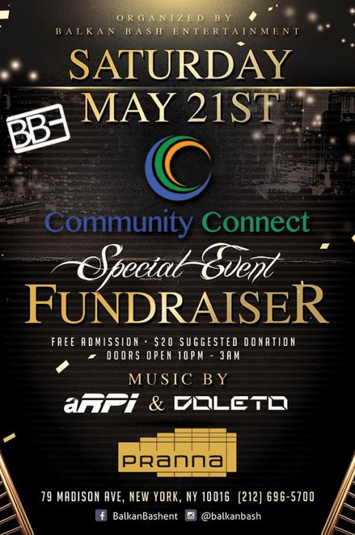 ** The last BALKAN BASH before the summer and its for a great cause ** Balkan Bash Ent (BBE) is teaming up with Community Connect for a fundraiser. It is a regular BALKAN BASH taking place at Pranna Lounge in Manhattan on Saturday night, May 21. It's FREE to enter, but we ask all customers for a suggested donation of $20 at the door. ALL money will go to Community Connect to help them with organizing future events where our younger generation can mingle with professionals within our community. It's time we start helping out one another. DJ aRPi & DJ Doleto will be providing the Balkan music. Doors open 10pm - 3am. This event is for everyone 21+ since donations will go for a good cause. Please tell your friends & family! For VIP, please contact Rasim PjetroviЫ€ 201-458-2187 to reserve a table. SEE YOU THERE!!!