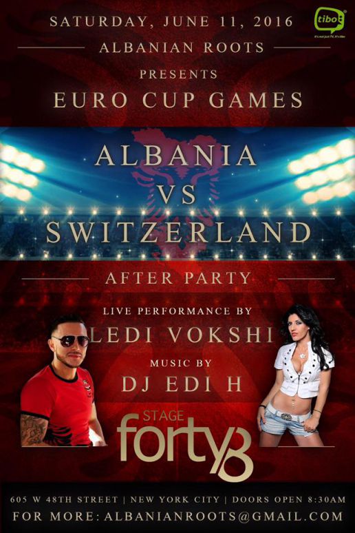 Albanian Roots will be hosting Albania vs Switzerland LIVE at STAGE 48. FREE ENTRANCE - live music by Ledi Vokshi & Dj Edi H First 30 people receive a FREE Albanian Roots Shirt! For VIP Seating or bottle services call Marko 516-668-2726 or email AlbanianRoots@gmail.com