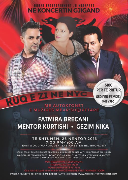 Arber Entertainment ju mirepret ne Koncerting Gjigand ny. KUQ E ZI NE NYC me autoktonet a muzikes Shqiptare. Fatmira Brecani, Mentor Kurtishi, dhe Gezim Nika.