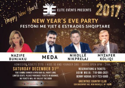 MEDA - NIKOLL NIKPRELAJ - NAZIFE BUNJAKU - MYZAFER KOLIQI Join us and this all star line up Saturday night December 31, 2016 New Year's Eve @ Greentree Country Club 538 Davenport Ave, New Rochelle NY 10805 Doors open 8pm to 2am Five Course Dinner & Top Shelf Open bar all night. Reservations are a must. Tickets $170 / $80 for children 10 & under. Tickets will be delivered in advance of the party. No tickets will be sold at the door. All ages are welcome. Dress to impress! For information & reservations, contact: Agim Muja 718-986-2831 Benny Hoxha 917-723-5065