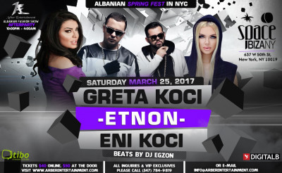 ARBER ENTERTAINMENT PRESENTS ALBANIAN SPRING FEST @ SPACE IBIZA NYC ON SATURDAY MARCH 25, 2017 FEATURING | GRETA KOCI | ENI KOCI & ETNON (Etno Engjujt) | Beats By DJ EGZON. TICKETS AVAILABLE ONLINE @ www.arberentertainment.com VIP RESERVATIONS & INQUIRIES PLEASE CALL (347) 784-9819 OR E-MAIL info@arberentertainment.com